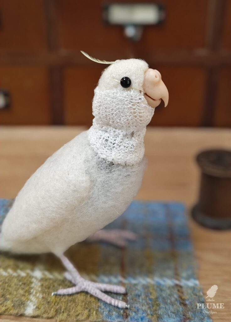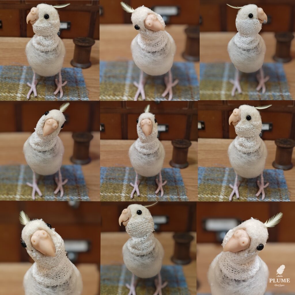 かわいいお針子さんを制作している間、次の作品も並行して進めていました。オカメインコを予定しているのですが、首をかしげた可愛い姿を再現したくて色々試行錯誤していました。↓こういう可愛い姿に仕上げたいです♪